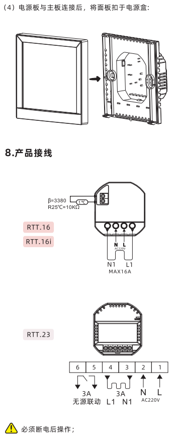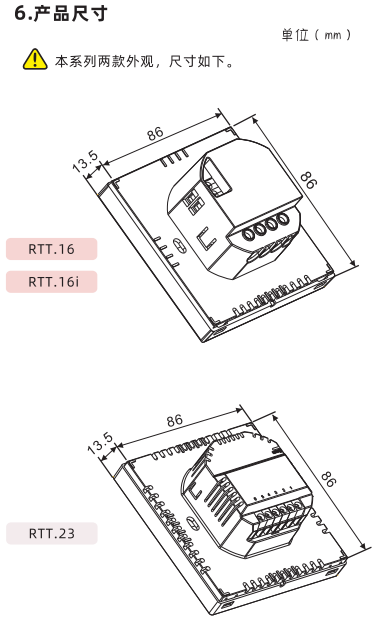 menred曼瑞德地暖温控器RTT.23/RTT.16/RTT.16i面板开关产品尺寸安装和接线方法教程